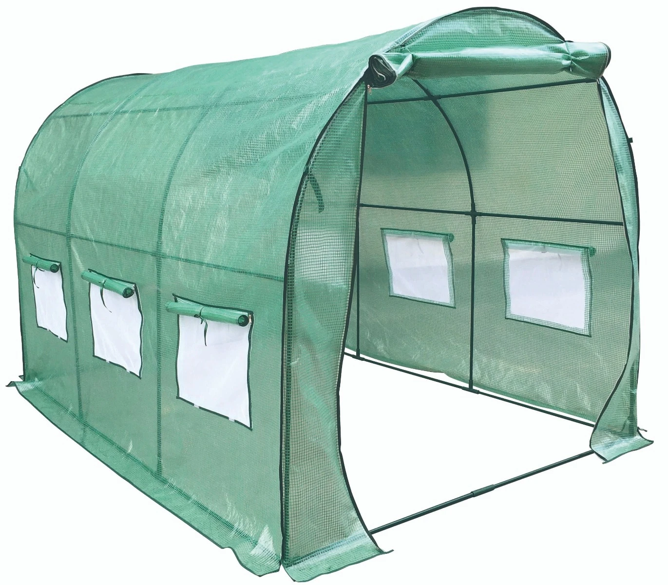 This spacious walk-in tunnel greenhouse is the perfect solution for the real gardener out there who wants to grow the garden all seasons of the year. Featuring a durable mesh PVC cover which protects from direct sunlight, is waterproof and UV resistant; and a sturdy powder coated steel tube frame. This product also features 3 ventilated windows on each side to provide your plants with indirect sunlight and terrific flow-through ventilation. It has a wide roll-up cover at each end for quick and easy walk-in access, additional ventilation, and moisture control. With doors at each end, you can even line up more than one for extended greenhouse gardening.