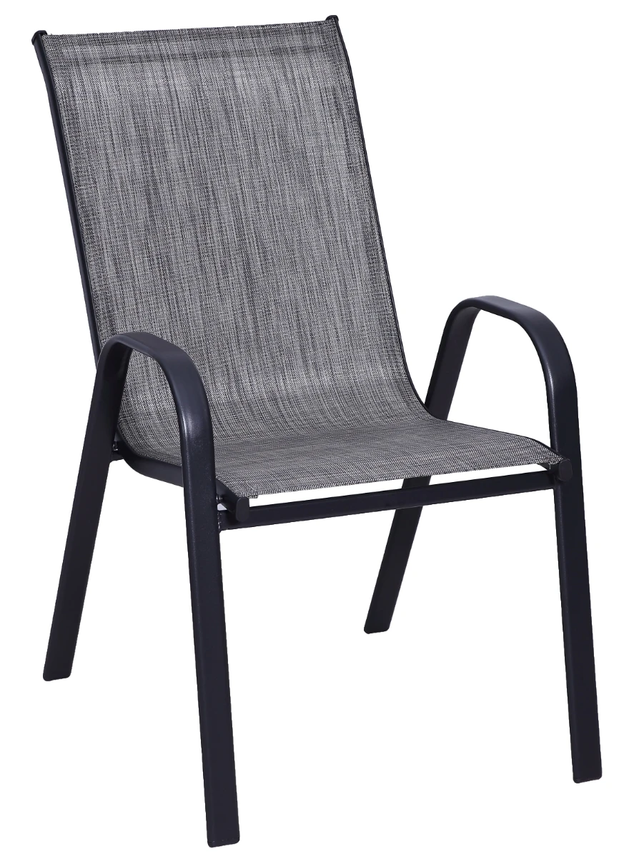 Stack patio chair with sling fabric seating and powder coated steel frame.