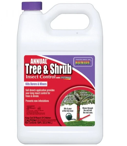 BONIDE Annual® Tree & Shrub kills borers and other listed insect pests for up to one year. Mix and pour at the base of trees & shrubs (no spraying needed). Kills emerald ash borers.