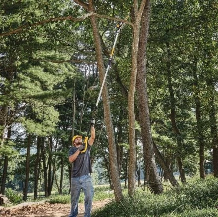 The DEWALT 20V MAX* XR Brushless Cordless Pole Saw comes equipped with an 8 in. Bar and Chain to handle all of your pruning needs. It features a high efficiency brushless motor that delivers up to 96 cuts per charge. The well balanced design and durable pole shaft extends up to 10 ft. for a total reach of 15 ft. It has an auto oiling feature for added convenience and time saving. It also features metal bucking strips for a durable cutting grip and a tree hook allows you to easily remove pruned branches.