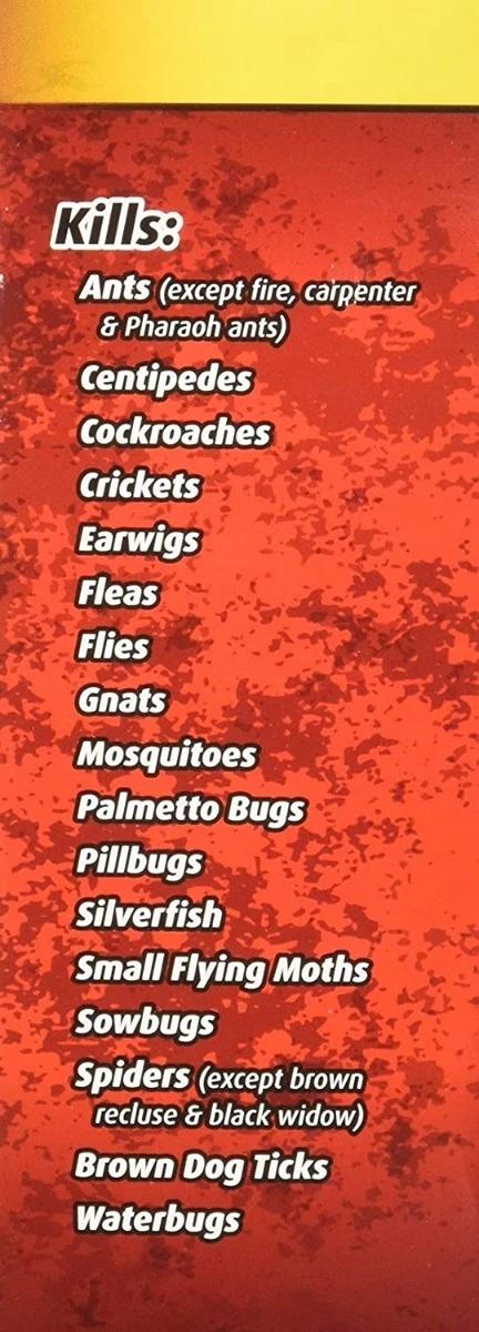 - Controls ants, cockroaches, crickets, earwigs, fleas, flies, mosquitos, pill bugs, spiders, brown dog ticks, water bugs and many other insects