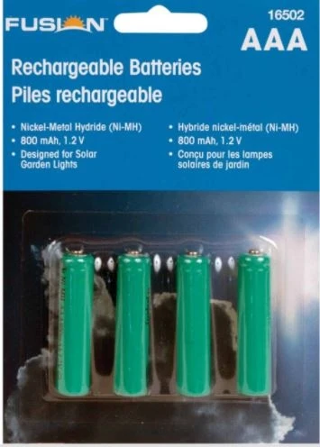 Rechargeable Ni-MH batteries. Designed specifically to power outdoor solar lights. Uses the power of sunlight to recharge. Easy to install and are long lasting.