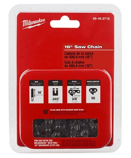 The Milwaukee® 16″ Saw Chain is to be used with the Milwaukee M18 FUEL™ 16″ Chainsaw (2727-20). The design delivers fast cuts with low vibration and minimal kickback. The chain features a durable design and is weather resistant for increased life.