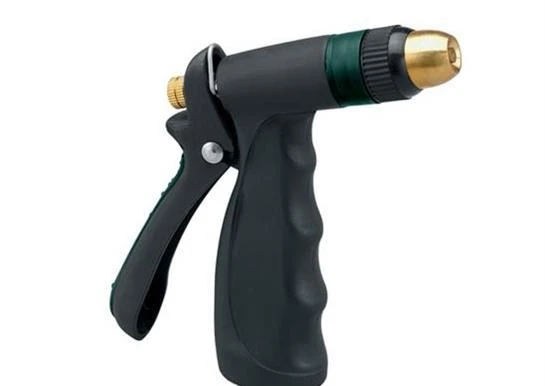 This nozzle is fully adjustable to spray from a fine mist for watering delicate plants to a jet stream for cleaning sidewalks and driveways. It is made of high impact zinc construction with an Ergo Light comfort grip and rear flow-control handle. The adjustable pistol is brass with a tip protector.
