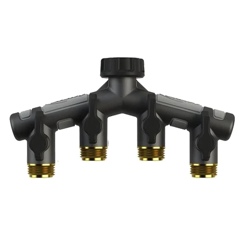 This metal hose faucet manifold converts your faucet into a 4-faucet hose connection. Convenient valve controls let you adjust the flow, or shut-off each connection individually. The 3/4″ male-threaded connection has a brass swivel head with comfort grip for easy installation. Heavy-duty construction with leak-free ball valves ensures quality performance.