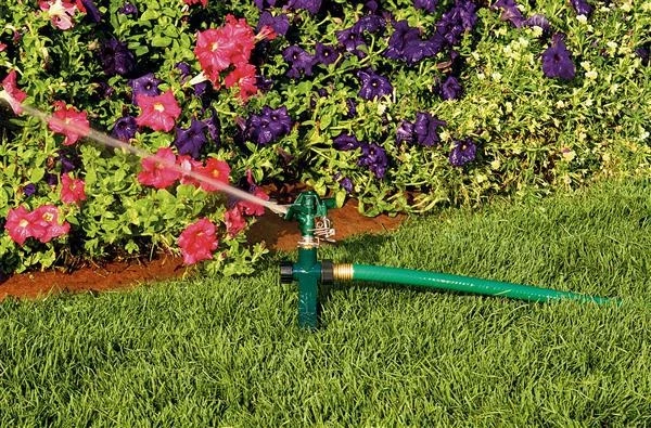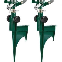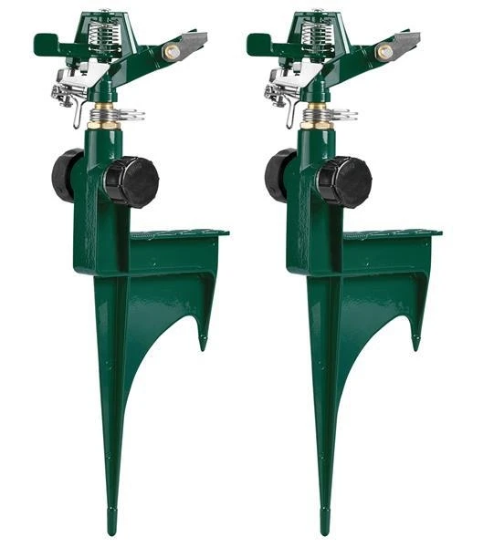 This sprinkler is designed to be used either as a single sprinkler or connected in a series. It is completely adjustable to cover a radius from 20 to 40 ft., in a full or partial circle. The head is made of zinc.