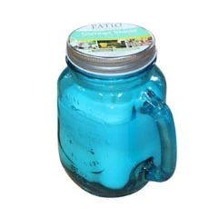 Citronella candle in colored mason jar. Perfect for use on the patio. Contains 3% citronella oil.