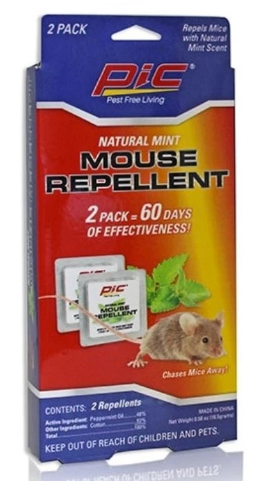 The PIC Natural Mint Mouse Repellent contains a natural formula with a mint fragrance to ward off mice. Includes 2 repellent packs, each pack is good for up to 30 days.