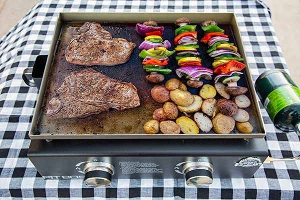 Lightweight and ultra-portable, this two-burner griddle is great for tailgating, picnicking, or camping. It features non-slip tabletop legs and a 4.7mm thick, pre-seasoned surface. You can cook with ease and enjoy quick mess-free clean up, thanks to the built-in front-loading grease tray. With 289 square inches of cooking surface, this tabletop griddle can handle everything from scrambled eggs and pancakes to burgers, steaks, and more.