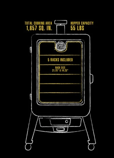 The Pit Boss Sportsman 5-Series Wood Pellet Vertical Smoker delivers 100% hardwood-fired flavor to meat, game, fish, jerky, and more. This Pit Boss 5-Series smoker features five adjustable cooking racks with 1,1513 square inches of total cooking space. The large view window lets you monitor the cooking process and remaining pellets without opening the door, while the dial-in digital control board makes it easy to set and adjust the temperature. The Sportsman 5 smoker also comes with six sausage hooks and a meat probe. Whether you’re smoking wild game or brisket, the Pit Boss Sportsman 5-Series Wood Pellet Vertical Smoker gives outdoorsmen a powerful cooking experience designed for set-it-and-forget-it smoking.