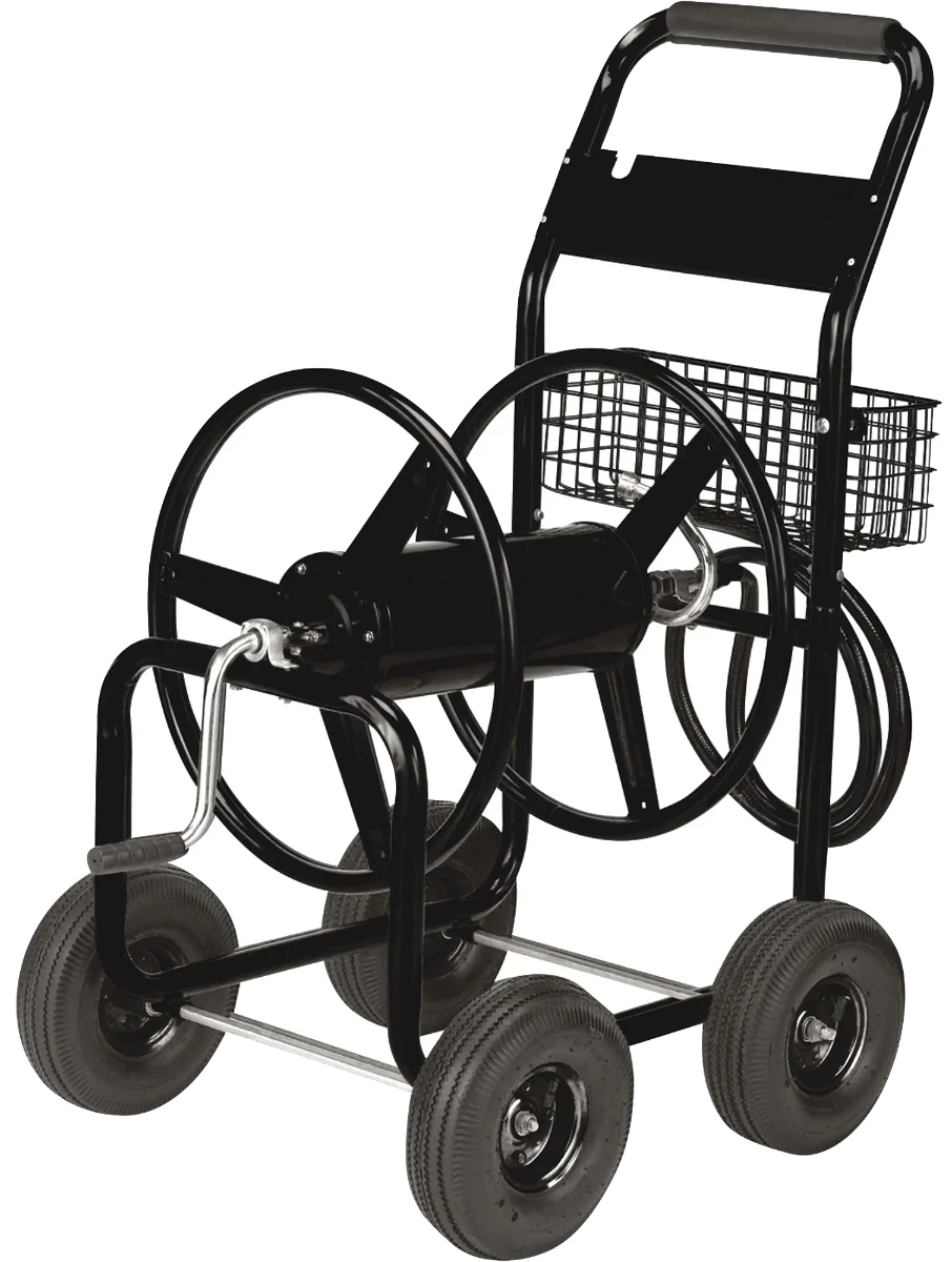 The Garden Hose Reel Cart for foot hose from Red Mountain Valley is a portable unit that makes it easy to get the hose right where you need it. The cart is designed for a 5/8″ x 300 ft hose and comes with four 10″ flat free tires for easy transportation. This cart is ideal for homeowners, grounds maintenance crews and anyone who needs a very long hose. It features an integrated cage to hold accessories and a wagon styling which offers high mobility. This cart is finished off with heavy duty brass fittings and a durable powder coating for longer lasting durability.