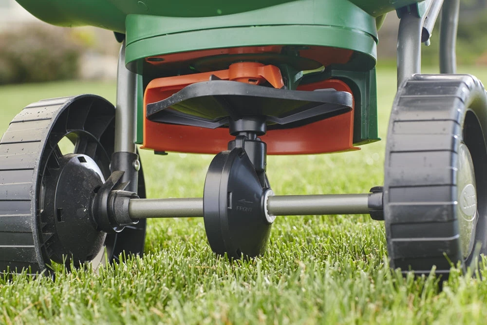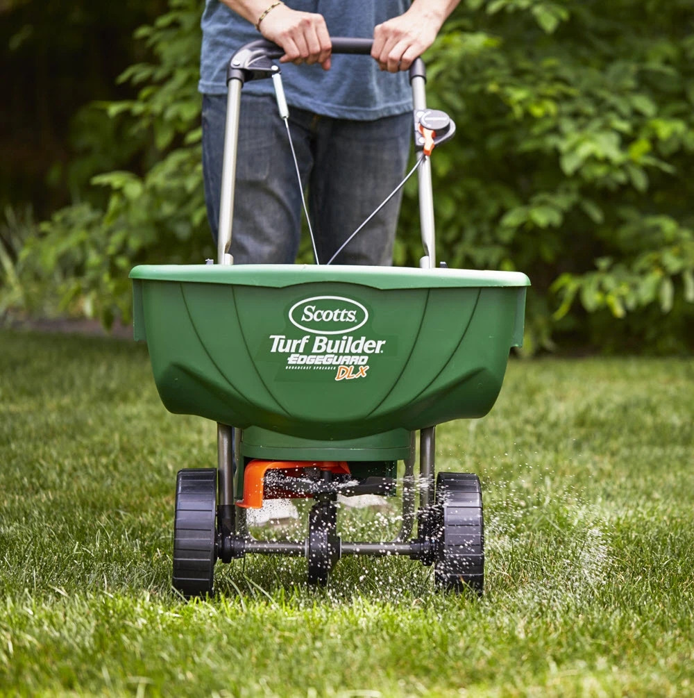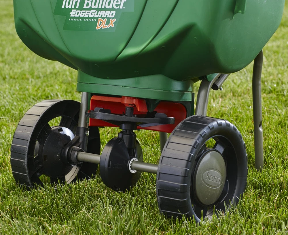 Use the Scotts Turf Builder EdgeGuard DLX Broadcast Spreader to apply grass seed and fertilizer in spring, summer or fall. The large hopper holds up to 15,000 sq. ft. of Scotts Lawn Care Products and is delivered ready to use and pre-calibrated; no assembly required