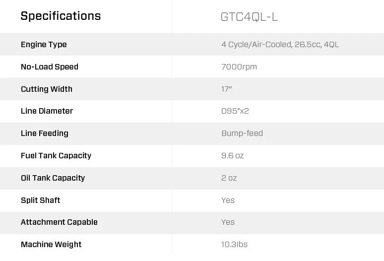 - 26.5cc 4QL 4-cycle Full crank engine for low vibration and no mixing of gas & oil