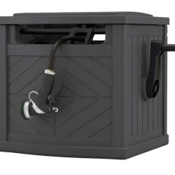 Keep your garden hose neat and organized with the Suncast® 150 ft. Hose Hideaway®. The attractive, wood-look design fully conceals your hose, protecting it from UV rays and extending its life span. The featured Slide Trak® hose guide provides manual tracking assistance for even rewinding onto the reel to maximize capacity. Constructed of durable, weather-resistant resin, the Hose Hideaway® is easy to maintain and built to last throughout each season.