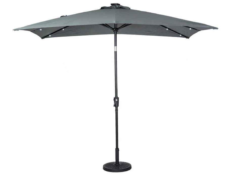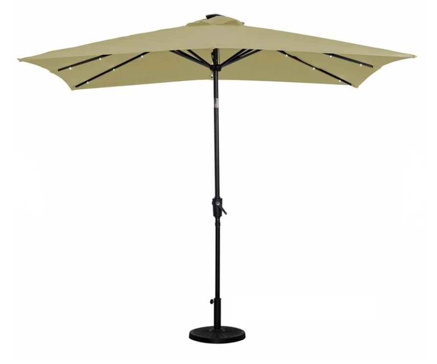 Get ready to entertain from dusk until dawn with the 9’x7′ Rectangular Aluminum Solar Lighted Umbrella. This umbrella is a versatile item that moves seamlessly from day to evening use. This beautiful accessory will transform any outdoor area into your favorite place to relax with friends, or enjoy a meal at your outdoor table even after the sun goes down. This umbrella provides plenty of shade on hot summer days. Simply tilt the umbrella using the tilt function to the perfect angle. This umbrella has a square solar panel at the top, which powers the lights along the umbrella ribs for 9 to 12 hours without the need for electricity. The umbrella pole is standard sized and fits most umbrella stands as well as most dinning and bistro sets that are designed to accommodate umbrellas.