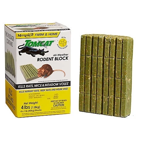 Tomcat All-Weather Rodent Blocks are a proven, popular way to control rats and mice. They provide economical control using the active ingredient Diphacinone, a multiple feed anticoagulant that has delivered proven results for more than 25 years. Each box contains 4 individually wrapped 1 lb. Bars of Bait and can be used indoors and out.